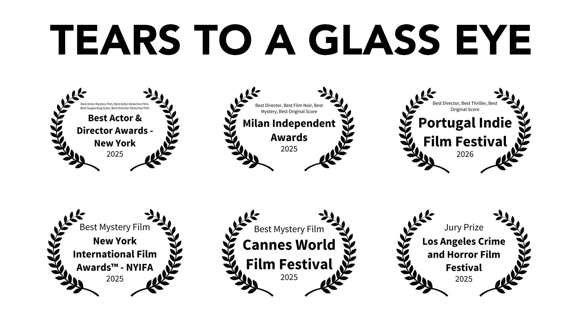 “Tears to a Glass Eye” is the winner of multiple prestigious awards, including: Jury Prize at the Los Angeles Crime and Horror Film Festival; Best Mystery Film at the New York International Film Awards; Best Director, Best Film Noir, Best Mystery and Best Original Score at the Milan Independent Awards; Best Actor-Mystery Film, Best Actor- Detective Film, Best Supporting Actor and Best Director-Detective Film at the Best Actor & Director Awards--New York; Best Mystery Film, Cannes World Film Festival; and most recently, Best Director, Best Thriller and Best Original Score at the Portugal Indie Film Festival.
